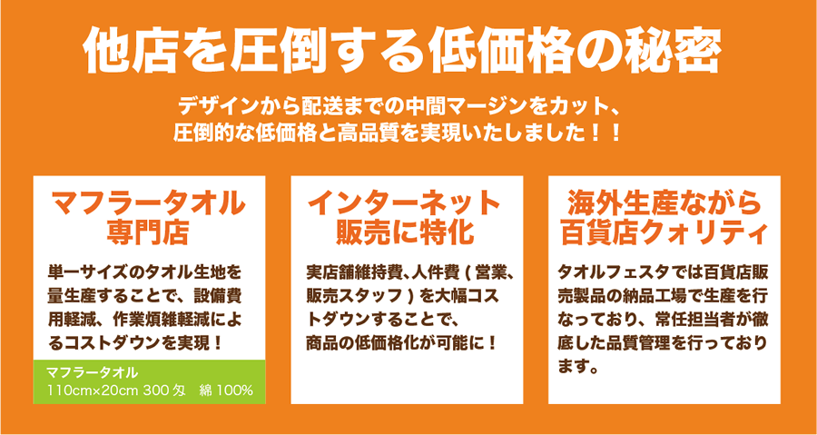 - 単一サイズのタオル生地を量産することで、設備費用軽減、作業煩雑軽減によるコストダウンを実現! マフラータオル: