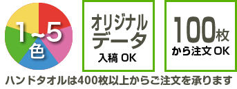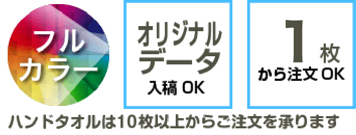 オリジナルデザインを最も表現豊かにプリントできる製法!小ロットの注文に最適です。色数の制限がなく写真やグラデーションを使ったカラフルなタオルが作れます。インクが毛中まで浸透し、発色がよくプリント面も柔らかい”染料”と生地の表面にインクを付着させ安価な”顔料”の2種類を選べます。