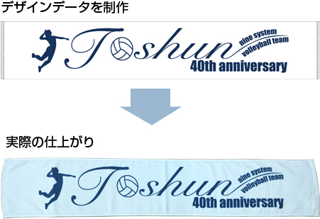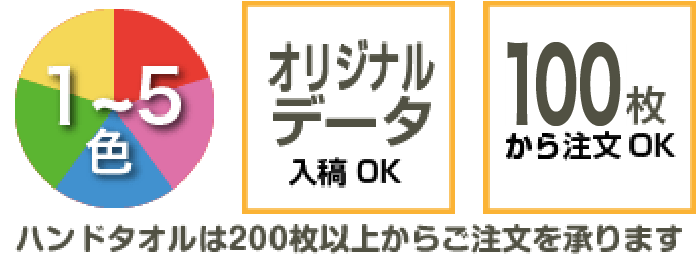 プリント可能範囲内に自由にデザインできます。タオル地の表面にインクを乗せる顔料スクリーンプリントと違い、染料スクリーンプリントは生地の繊維の根元から染め上げるため、タオル本来の肌触りが損なわれず見た目も美しく仕上がります。仕上がりのクォリティにこだわりたい方へ!