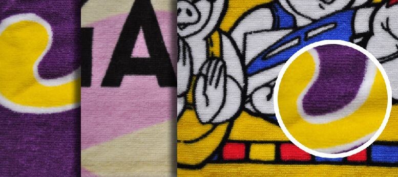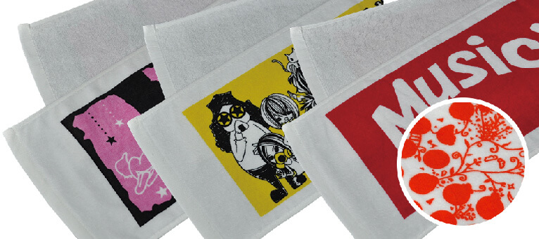 オリジナルデザインを最も表現豊かにプリントできる製法!小ロット「1枚から製作可能」の注文に最適です。色数の制限がなく写真やグラデーションを使ったカラフルなタオルが作れます。品質重視ならインクが毛中まで浸透し、発色がよくプリント面も柔らかい”染料”、価格重視なら生地の表面にインクを付着させシャープな表現可能な”顔料”の2種類から選べます。※濃色の場合、顔料は染料に比べ、比較的薄目の仕上がりになります。